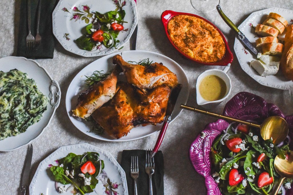 I didn’t photograph the prep because honestly… spatchcocking a chicken feels very American Psycho. But trust me, it’s worth it: I spatchcock, dry brine for 48 hours, and push garlic-herbed compound butter under and over the skin.